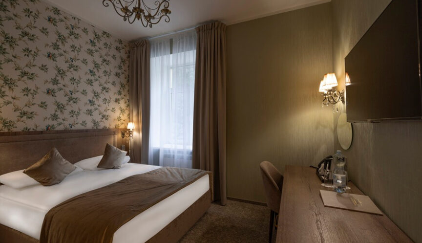 Номера идеально подходят для размещения двух человек. В комнате установлена двуспальная кровать размером 160х200 см, две прикроватные тумбочки, шкаф для одежды с вешалками, туалетный столик, зеркало и стул. В номере также предусмотрены встроенный мини-холодильник, сейф, телевизор, кондиционер, чайная станция, гладильная доска с утюгом и сушилка для белья. В ванной комнате вы найдёте ванну, унитаз, раковину с тумбой, зеркало и фен. Из некоторых номеров открывается живописный вид на парковую зону и кроны елей. Все номера оснащены необходимыми гигиеническими принадлежностями индивидуального пользования.